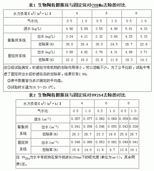 试验采用沉淀池出水作为待处理水,并分别采用不同水力负荷[4~10m3/(m2.h)]和气水比(0.5~1.0)等各种工况,对生物陶粒膨胀床的处理效果进行了考察。同时,在相同条件下(水质、水温、水力负荷、气水比等)与生物陶粒固定床作对比研究,考察了两者去除CODMn、UV254的效果,结果见表1、2。