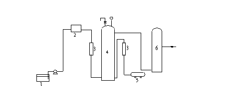 试验工艺流程如图1所示,加压生物接触氧化反应柱为一不锈钢管,内经为80mm,有效高度1.92m,有效容积9.6升,内挂一根直径约为70mm的组合式生物填料。气体流量计和液体流量计均为LZB-4型玻璃转子流量计,空压机为ZB0.1/8型空压机。