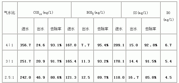 表2 压力为0.2Mpa时,不同气水比时反应器内溶解氧浓度及污染物去除率
