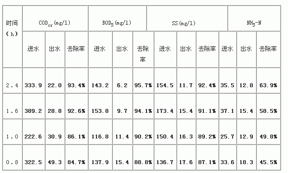 在压力为P=0.2Mpa,气水比为4:1的条件下,考察了不同水力停留时间对污染物去除率的影响,结果见表4。