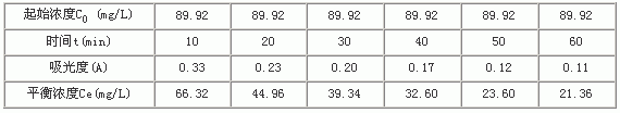 取浓度810-4mol/L(89.92mg/L)的镉离子溶液50mL,共6份各自编号;置于锥形瓶中,分别调整PH值到6,然后分别加入30mg干燥的改性壳聚糖。放入恒温震荡器中震荡,温度25℃:分别在10min、20min、30min、40min、50min、60min后,取出,抽滤,将滤液放入锥形瓶中,吸取25mL,按照以前的方法测定吸光度A,对照标准曲线,求出吸附后溶液的残留镉离子浓度。