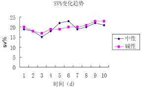 开始时,间歇曝气,每曝气8小时停两小时。每天测定两个池中的SV%,温度,pH值,并定时镜检观察。控制温度在25OC,pH值分别为7(10L池)和8(1L池),中性、碱性池SV%变化如图一所示。
