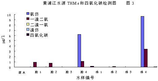 图3为黄浦江原水,前后加二氧化氯,与前后加化合氯对比。测定结果表明,闵行原水不含三卤甲烷和四氯化碳(低于检测限),前加不同量二氧化氯后,滤1、滤2、滤3除一溴二氯甲烷分别为0.89、0.71、<0.07mg/l外,无其他三卤甲烷和四氯化碳产生,前加氯后滤4的氯仿为6.2mg/l,一溴二氯甲烷为1.1mg/l,一氯二溴甲烷为<0.2mg/l,无三溴甲烷,四氯化碳为0.18mg/l。后加二氧化氯,消1、消2、消3的氯仿为<0.5mg/l,有微量一溴二氯甲烷,无一氯二溴甲烷,无三溴甲烷和四氯化碳。后加氯的水样消4,氯仿升高为9.6mg/l,一溴二氯甲烷为3.4mg/l,无一氯二溴甲烷,无三溴甲烷,四氯化碳为0.08mg/l。