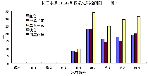 图6为长江原水,前后加二氧化氯,与游离氯对比。测定结果表明,长江原水不含三卤甲烷和四氯化碳(低于检测限),前加不同量二氧化氯后,滤1、滤2、滤3除一溴二氯甲烷分别为0.6、<0.07、0.4mg/l外,无其他三卤甲烷和四氯化碳产生,前加氯后滤4的氯仿为7.9mg/l,一溴二氯甲烷为6.0mg/l,一氯二溴甲烷为5.2mg/l,无三溴甲烷,四氯化碳为0.12mg/l。后加二氧化氯,