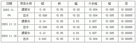 该项目的检测是委托国家城市供水水质监测网重庆监测站进行的,具体检测结果见表2。从表2可知,该滤池对金属铝有很好的去除效果,而其它金属或金属离子因滤前水中含量很低,其去除效果不明显。