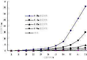 由图7可知,在同一过滤时间,水头损失随滤层深度增加而减少,水头损失主要集中在0.40m滤层深度内,且随着时间的推移深层截污比例逐渐加大,深层水头损失也加大。在0.9m滤层深度的水头损失由过滤时间1小时的0cm增加到过滤时间71小时的2.4cm,而在0.15m滤层深度的水头损失由过滤时间1小时的0cm增加到过滤时间71小时的36.3cm。