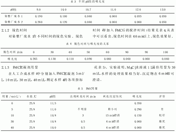 易除去,而有些则很难除去,特别是水溶性较强的染料(如活性染料)。使用活性炭吸附处理,虽然脱色效果较好,但是活性炭的价格较高,再生困难,只能使用一次。有颜色的工业废水,许多染料对某些生物是有害的,直接破坏水中的生物,失去自然平衡,常用絮凝剂进行凝聚、澄清、净化。常用的絮凝剂有FeCl3.6H2O、FeSO4.7H2O、A1C13、聚合氯化铝和聚合硫酸铁〔6〕,一般需要投人大量的药剂,费用较高,本实验应用新型絮凝剂FMC,对染整厂排出的有色废水,进行脱色处理,经过大量的实验积累了一些经验与大家交流。