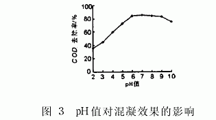 3.2pHÖµ¶Ô»ìÄýЧ¹ûµÄÓ°ÏìÔÚ³£Î¼°»ìÄý¼ÁͶ¼ÓÁ¿Îª60mg/LµÄÌõ¼þÏ£¬ÓÃÏ¡ÁòËáºÍÏ¡ÇâÑõ»¯ÄÆÈÜÒºµ÷½Ú·ÏË®µÄpHÖµ£¬¿¼²épHÖµ±ä»¯¶Ô»ìÄýЧ¹ûµÄÓ°Ï죬½á¹û¼ûͼ3¡£Í¼3±íÃ÷£ºpHÖµ¶Ô»ìÄý¼ÁµÄ»ìÄýЧ¹ûÓкܴóµÄÓ°Ï죬ÔÚpHֵΪ6¡«9·¶Î§ÄÚ£¬PBS»ìÄý¼ÁÓкܺõĻìÄýЧ¹û£¬CODCrµÄÈ¥³ýÂÊÔÚ80%ÒÔÉÏ£¬ÇÒÔÚpHֵΪ7.0ʱ³öÏÖ×î´óÖµ£¬CODCrµÄÈ¥³ýÂÊ´ï85.2%¡£ÕâÊÇÒòΪpHÖµ²»Í¬£¬»ìÄý¼ÁÉú³ÉµÄË®½â²úÎﲻͬ£¬Îü¸½Î¢Á£ÒÔ¼°Ñ¹ËõË«µç²ã¼°µçÖкÍ×÷Óò»Í¬£¬Òò¶ø»ìÄýЧ¹ûÒ಻ͬ¡£
