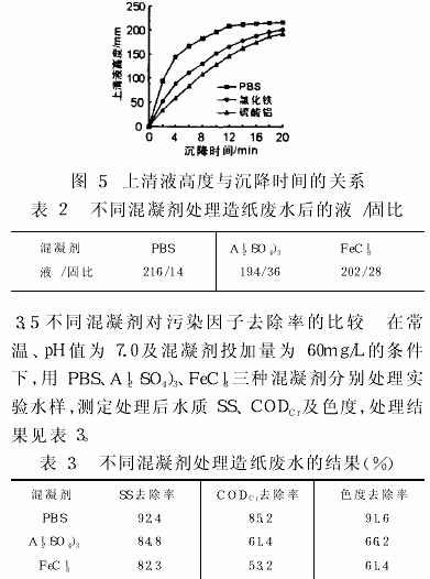 3.4²»Í¬»ìÄý¼Á³Á½µÐÔÄܱȽÏÔÚ³£Î¡¢pHֵΪ7.0¼°»ìÄý¼ÁͶ¼ÓÁ¿Îª60mg/LµÄÌõ¼þÏ£¬°´»ìÄý³Á½µÊµÑé·½·¨£¬ÔÚ500mL·ÏË®Öзֱð¼ÓÈëPBS¡¢Al2(SO4)3¡¢FeCl3ÈýÖÖ»ìÄý¼Á´¦Àíºó£¬µ¹Èë500mLÁ¿Í²ÖУ¬¹Û²ì²âÁ¿²»Í¬³Á½µÊ±¼äµÄÉÏÇåÒº¸ß¶È£¬½á¹û¼ûͼ5¡£20minºóÁ¿È¡µÄÇåÒººÍ³Áµí¸ß¶È(mm)£¬¼û±í2¡£