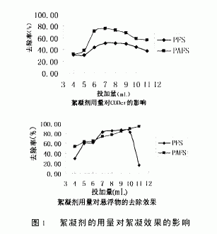 絮凝剂的用量和溶液中的悬浮物有关,其最佳用量要根据实验测得,实验过程中为了考察复合絮凝剂的优势,在相同条件下加聚合硫酸铁(PFS)做对比。相同条件下,絮凝剂的投加量对絮凝效果的影响见图1。