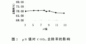 用盐酸和氢氧化钠调节原水的pH值后,再加入最佳用量的PSAF,搅拌、静置,然后测定CODCr。pH值对絮凝剂的影响见图2。