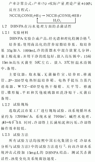 (2)DBNPA在冷却水系统中的应用试验表明:DBNPA具有优良的杀菌性能,杀菌迅速,药效持久,细菌控制稳定,细菌指标合格率达100%。同时,DBNPA对粘泥具有良好的剥离效果;兼有较强的缓蚀能力,具有一剂多效的功能。作为高效低毒、环保型的水处理剂和杀菌剂,DBNPA具有广阔的应用前景和开发价值,值得在我国推广使用。