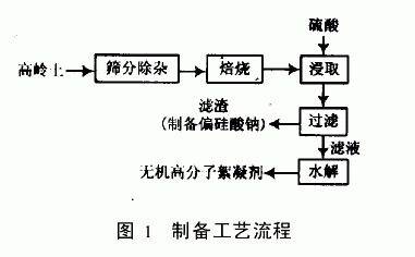 (3)将浸取过的高岭土过滤,滤渣用于制备偏硅酸钠(在研课题),滤液经调节pH值、水解等制备出聚合Al2(SO4)3,用于碱法麦草浆造纸黑液处理应用试验。