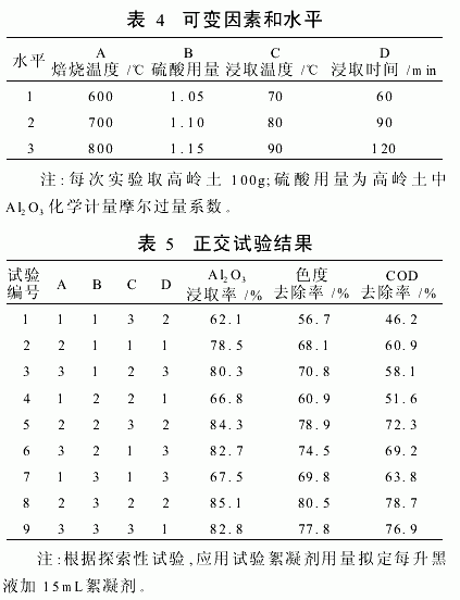 根据探索性试验的初步数据,确定了影响比较小的因素为固定因素,即焙烧时间固定为2h,浸取调浆时采用水∶高岭土=5∶1,以焙烧温度、硫酸用量、浸取时间和浸取温度为可变因素,每个因素选择三个水平。并且以Al2O3浸取率、色度去除率和COD去除率为目标因素,经过L9(34)正交试验来观察可变因素的变化对目标因素的影响程度。其可变因素与水平见表4。