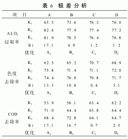 从表6可知,浸取温度对Al2O3浸取率的影响趋势是随温度升高而增大,从70℃升到80℃时影响幅度较大,在80℃时Al2O3浸取率和黑液的色度去除率出现最高点,再升高温度则呈现下降趋势;而COD的去除率到80℃以后,增长幅度较小。因此,浸取温度选择80℃为宜。