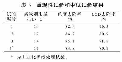 从表5和表6可以看出,四个可变因素中影响最大的是高岭土的焙烧温度,其次是硫酸用量,浸取时间和温度的影响较小。从三个目标因素优化水平综合分析,筛选出优化的工艺条件是:A2B3C2D2,并按其进行了重现性试验和碱性麦草浆造纸黑液工业化处理应用试验,其结果见表7。