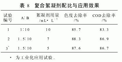 用高岭土制备出的絮凝剂虽然比较廉价,应用于造纸黑液处理时效果也比较好,但从处理后的过滤滤液再循环使用要求来说,效果不太理想,对造浆有些影响,而且使用量比较多。为此,笔者将自行研制的三元改性玉米淀粉制备成稀糊状絮凝剂A,再与高岭土制备的絮凝剂B混合做复合絮凝剂,其应用效果见表8。