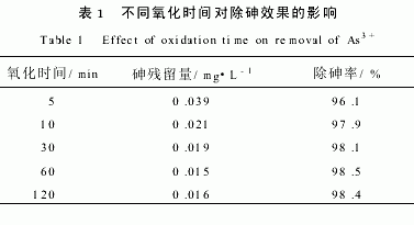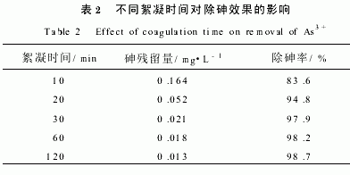 同时研究不同絮凝时间对高铁除砷的影响.含砷量10mg/L的原溶液,加入20mg/L的高铁,氧化10min后,调节pH至产生絮体,分别絮凝10min、20min、30min、60min、120min后结束搅拌,结果如表2所示.试验结果表明,絮凝10min,砷的去除率仅有836%,随着搅拌时间的延长,絮凝30min以上除砷效果好,这说明高铁的还原产物Fe(OH)3吸附砷的过程是缓慢的,且达到吸附平衡后,除砷率不再增加.本试验絮凝时间采用30min.