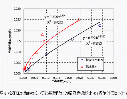 应急事故中粉末炭的投加量可以用烧杯试验确定。数据试验用水样应采用实际河水再配上目标污染物进行,由于水源水中存在多种有机物质,存在相互间的竞争吸附现象,对实际水样所需的粉末炭投加量要大于纯水配水所得的试验结果。图4为污染事件后详细补充试验所得到的松花江原水和纯水硝基苯配水的吸附等温线。