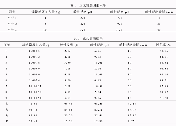 由文獻可知,影響廢水色度去除的主要因素有:鑄鐵鐵屑加入量和鹼性反應時間。根据前期靜態單因子實驗已初步确定了廢水處理的操作條件,為進一步确定最佳處理條件,選用L9(34)正交表考察鑄鐵鐵屑加入量、酸性反應pH、鹼性反應pH、鹼性反應時間對廢水處理效果的影響。正交實驗因素水平如表1所示,實驗結果見表2。