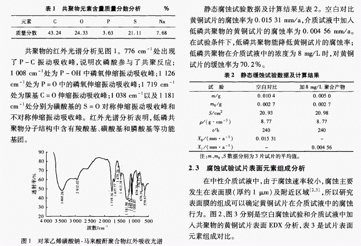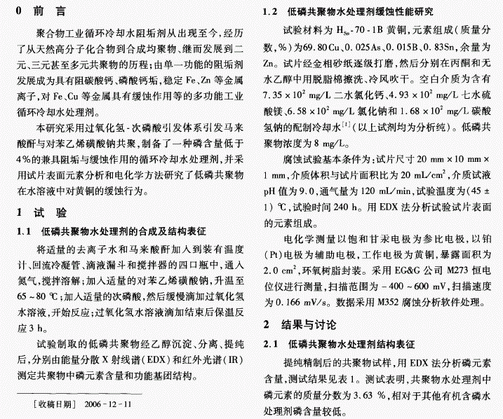 低磷共聚物循环冷却水处理剂对黄铜的缓蚀作用研究 西门观止 / 2016-12-31 浏览 采用过氧化氢.次磷酸引发体系引发马来酸酐与对苯乙烯磺酸钠共聚,制备了一种磷含量低于4%的新型循环冷却水处理剂。用试片失重法和电化学方法研究了自制低磷共聚物在配制循环冷却水中对黄铜的缓蚀作用,试片表面元素分析和电化学分析表明,低磷共聚物对黄铜的缓蚀作用是共聚物在黄铜试片 表面吸附形成的保护膜抑制了阳极电化学过程的结果。 阅读全文