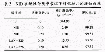 Óɱí3¿´³ö£¬NIDÔÚËáÐÔ½éÖÊÖжÔÂÁ¹ÒƬµÄ»ºÊ´Ð§¹û£¬Ã÷ÏÔµØÓÅÓÚLANÒ»826¡£µ±Í¶¼ÓÒ©¼ÁÖÊÁ¿·ÖÊýΪ0.1%¡«0.2%ʱ£¬Æä¶ÔÂÁ¹ÒƬ»ºÊ´Âʿɸߴï99%ÒÔÉÏ¡£