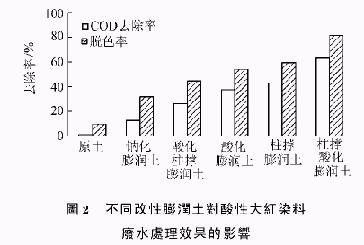 酸性大紅染料廢水和分散艷藍染料廢水處理方法:各取100mL染料廢水放入250mL錐形瓶中,加入一定量的改性膨潤土,攪拌振蕩1h后离心取上層清液,檢測脫色率和COD去除率。