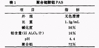 目前,普遍使用的无机高分子絮凝剂有铁系和铝系两大类,聚合硫酸铝和聚合硫酸铁分别是铝系和铁系的典型代表,两者有着不同的絮凝特性。聚合硫酸铝水解弱,絮凝体积小,疏松,沉降慢,但残余色度小,性能指标如表1所示;而聚合硫酸铁水解强,絮凝体积大,密实,沉降快,强度好,但残余色度大o