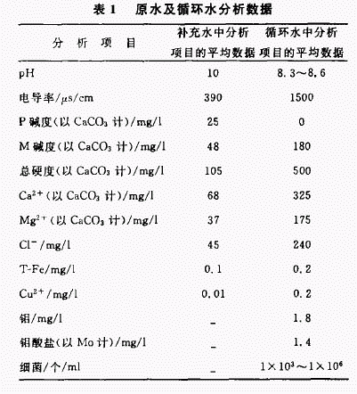 9801。该钼系复配水稳剂于l995年l2月系统开车时投用,循环冷却水补充水来源于黄浦江,经过混凝澄清和过滤处理后补人循环水池,水质条件