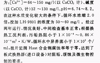 上海吴径化工总厂硫酸厂成立了中外合资的上海京藤化工有限公司,改硫铁矿焙烧制酸为硫磺制酸,装置中循环冷却水系统采用了板式换热器,水稳剂采用以钼酸盐为主剂,锌盐、有机膦酸盐、膦羧酸为配剂的复合配方,商品代号LH一