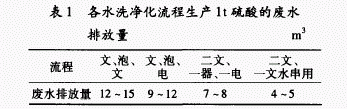 国内硫铁矿制酸净化工序主要采用稀酸洗净化流程,只有部分企业仍采用落后的水洗净化流程。稀酸洗净化的废水排放量较少,其主要是少量的生产污水、地坪和设备冲洗水、设备故障时短期排放的废水;而水洗净化使用一次性洗涤水,废水排放量大。稀酸洗净化的废水排放量与操作管理水平有很大关系,操作管理不严格很容易使废水排放量增加。水洗净化有几种不同类型的工艺流程,各流程生产1t硫酸的废水排放量见表1。