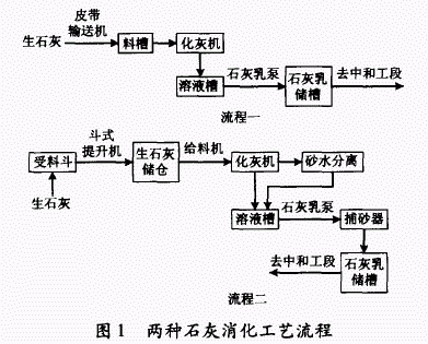 采用生石灰作为中和药剂时,投配方式有干法和湿法两种。国内生石灰中杂质多、块度大小不一,均匀、高细度的粉状石灰很少,因此大多采用湿法投配,即将块状或粉状生石灰经消化制成一定浓度的石灰乳(氢氧化钙悬浮液),一般有两种流程(见图1)。
