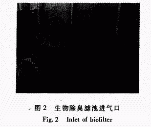 池、细格栅间和沉砂池进水渠、洗砂间和沉砂池出水渠。3台离心风机将收集的臭味气体从除臭滤池底部的3个进气口(图2)送入除臭滤池,风机出风口安装可调节气量的蝶阀和止回阀。总进气量为18000m/h.