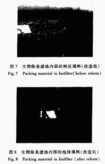 经上述设备改造后,生物除臭滤池运行了7个月。臭味气体的去除效果明显提高。设备改造前后生物除臭滤池的运行条件及臭味气体的去除效果列于表2。