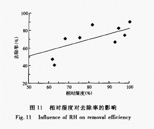 湿度的控制对于生物除臭滤池的运行非常重要,干燥的环境会使微生物体内的蛋白质变性,引起代谢活动停止。水是微生物生长所必不可少的,水在细胞中起到溶剂与运输介质的作用,营养物质的吸收与代谢产物的分泌必须以水为介质才能完成。因为水的比热容高,是热的良好导体,能有效地吸收代谢过程中产生的热并及时地将多余热量散发,从而有效地控制细胞内温度的变化。所以填料保持适宜的含水率和湿度,能够使微生物保持降解活性,使生物除臭滤池能够长期稳定运行。通常生物滤池的含水率一般控制在40%~80%,相对湿>99%。气体的相对湿度对去除效果的影响试验结果表明(图11):在相同条件下(硫化氢的平均进气浓度为1.75ms/m,温度为18.5℃),较高的硫化氢去除率是在较高的相对湿度(>80%)条件下获得的;相对湿度较低时,去除率也较低。实际中,通过调节喷淋系统的喷淋量、喷淋时间和喷淋次数,可以有效地使填料保持适合微生物生长的湿度条件。