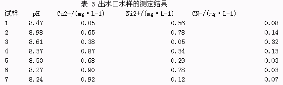 自安装了这套自动控制系统后,废水处理状况有了明显的改善,pH控制准确,水质清澈透明,悬浮物达标。为了验证这套含酸废水处理系统的可靠性,连续一个星期从废水出水口取样测定,测定项目为pH、铜、锌、镍和氰的质量浓度,结果列于表3。在这套废水处理系统中,含氰废水经过处理后流入二级中和池,与含酸废水一同进入下一道处理工序,因此,在表3中也给出了氰化物的测定数据。分析结果表明,这套系统处理过的含酸废水pH和重金属离子符合国家二级排放标准。