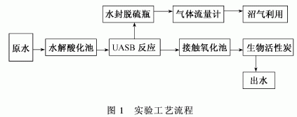 实验用的水解酸化池采用高100cm,内径为10cm的有机玻璃圆柱体,有效容积为6L。UASB反应器高150cm,内径为8cm,有效容积也为6L。接触氧化柱高100cm,内径10cm,有效容积也为6L。其中UASB反应器采用夹套水浴保温,用温控继电器和加热棒控制水浴恒温36.5~37.5℃。进水计量器采用恒流泵,流量由每分钟的转数确定。各个容器都采用连续进水方式,其中水解酸化柱和UASB反应器进水由底部进料口进入,在顶部溢流出水,UASB反应器所产沼气由集气罩收集,经水封瓶脱硫后,由湿式气体流量计计量产气量。因为好氧柱为曝气柱,曝气头在柱的底部,气体由下而上,为了延长废水与污泥的接触时间,因此好氧柱采用上进水下出水的方式。