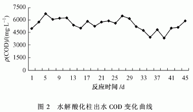 水解酸化处理是指将厌氧过程控制在水解和酸化阶段,利用兼性的水解产酸菌将复杂有机物转化为简单有机物。水解酸化反应器将厌氧消化控制在反应时间较短的水解酸化段,使原污水中不溶的有机污染物溶解,可溶的部分复杂污染物得到降解。水解主要发生在细胞外,在兼性厌氧微生物胞外酶作用下进行。水解形成的小分子有机物被细菌用做进行发酵的碳源或氮源。这些发酵作用的氧化最终产物主要是短链的挥发性脂肪酸。水解是复杂的非溶解性聚合物被转化为简单的溶解性单体和二聚体的过程。水解过程通常较缓慢,被认为是含高分子有机物或悬浮物废水厌氧降解的限速阶段。废水经水解酸化后,COD的变化见图2。