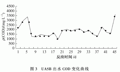 UASB反应器的基本构造主要由污泥床、污泥悬浮层、沉淀区、三相分离器及进水系统等组成,其中反应区的颗粒污泥是反应器的核心。运行过程中,废水从反应器底部经布水系统均匀进入,并向上流经反应区(污泥区)进入气固液分离区,最后进入UASB上部的沉淀区。混合液中污泥通过重力作用自沉淀区经三相分离区返回反应区,所产生的沼气则由集气室经管道排出反应器。在UASB内部无任何机械搅拌装置,其通过水流的上升及处理过程中所产生的沼气的上升搅动作用实现泥水的混合,一般不需要装填料,因而其构造简单,便于维护处理。废水经UASB反应器后,COD的变化见图3。