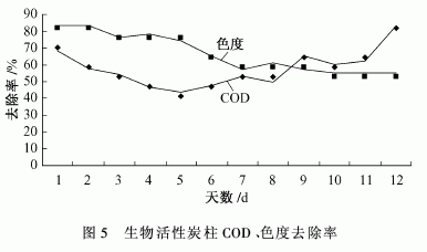 将经过水解酸化-UASB-接触氧化处理后的利福平废水出水进生物活性炭柱,采取下进水上出水方式。COD和色度去除率见图5所示。