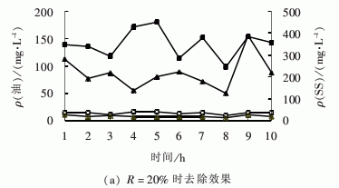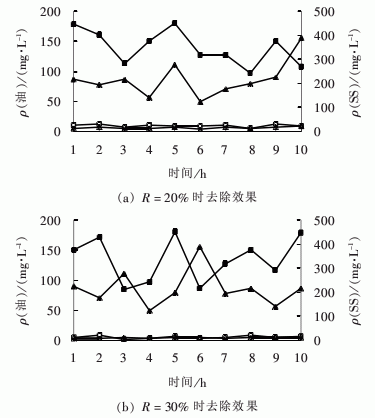 气浮池中加入斜板装置后的运行效果见图3。当加入斜板装置后,系统对采出水的净化效果有明显的改善:①当R=20%时,出水水质受进水水质的影响较大,当进水水质较差时,出水含油量不能满足要求。②当R=30%时,出水理想,能够达到出水要求,油和SS的去除率分别能达到94.8%和94.2%,出水ρ(油)≤9mg/L,ρ(SS)≤14mg/L。③当R=40%时,虽然出水效果很好,但耗能也随之增大,经济上不如R=30%时可行。