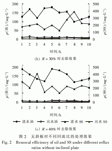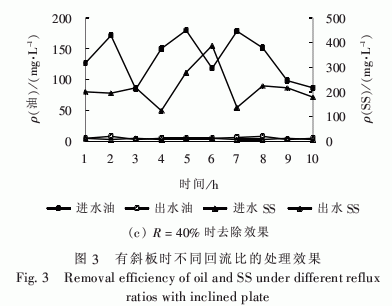 首先,进行分离池中不设斜板装置的气浮运行效果试验。试验在回流比R为20%、30%、40%的3种情况下进行。对原水的处理效果见图2。由图2可知:①当回流比为20%和30%时,出水稳定,但是当进水水质较差时,出水含油量较高,不能满足出水要求。②当回流比为40%时,出水水质良好,出水满足要求,油与SS的平均去除率分别能够达到94.5%和93.9%,出水ρ(油)≤10mg/L,ρ(SS)≤15mg/L。③回流比越大,油和SS的去除率越高,耗能也随之增大。④在气浮池运行过程中,浮渣需要及时清理,在浮渣层增厚的过程中会出现明显的落渣现象,影响出水水质。