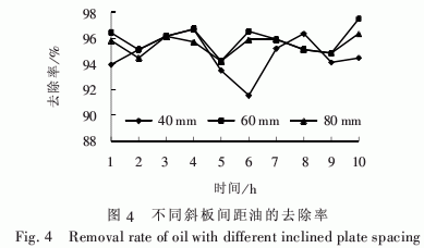 从图4中可以看出,当板间距为40mm时,气浮的除油率不稳定,这是由于板间距过小,使二次絮凝的絮团不能上浮,而是随水排出造成的。而当板间距为60mm和80mm时除油率较稳定,一直保持在94%~97%,出水含油量较低。