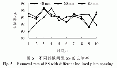 从图5中可以看出,当板距在40mm时SS的去除率开始一直呈上升趋势,而在4h之后呈缓慢下降趋势,表明斜板表面有粘附聚集絮体的作用。运行开始的一段时间内,聚集在斜板板壁上的絮体没有随水排出,而经过了一段时间,当絮体越来越大,成为絮团,受水的剪切力增大,最终随水排出。而当板间距为60mm时,SS的去除率一直稳定在92%~96%,出水水质良好;在板间距为80mm时,虽然去除率很稳定,但均低于板间距为60mm时的去除率。