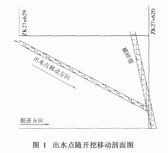 随着隧道的掘进,出水点位置由拱顶逐渐向断面右侧下部沿开挖轮廓线移动,围岩完整性和强度也逐渐增加。2006年12月20日,当隧道掘进至ZK27+620断面时,出水点位置固定在掌子面右侧的边墙脚处,不再向前延伸。通过对掌子面的围岩观察发现,该处有一条宽20cm的破碎带,和隧道中线夹角约80°,倾角约为85°,出水范围为拱脚向上1m~2m范围内。出水点随开挖移动剖面见图1。