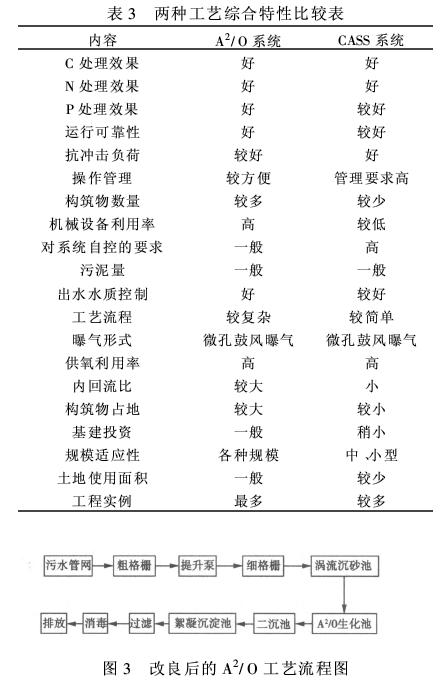在两种工艺总投资和运行成本上相差无几的情况下,着重在处理工艺技术上加以比较。以上工艺各有优缺点,但A2/O法对自控水平的要求较低,便于管理维护,具有一定优势。故本工程把改良的A2/O工艺作为该污水处理厂的最佳污水处理工艺。具体工艺流程见图3。