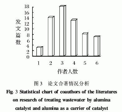 随着社会的不断发展,各学科的互相渗透现象越来越明显,而且科研需求和实际相结合,故许多科研活动要研究者们共同完成,这就体现在论文合著情况上。利用氧化铝催化处理废水文献的合著情况如图3所示。