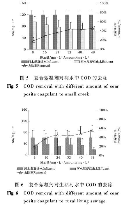 试验期间,河水的COD为102~146mg/L,生活污水的COD为35~88mg/L。投加PAC与PAM复合絮凝剂后,出水中COD下降明显,如图5、6所示。当投加量为24mg/L时,河水的COD平均去除率达到36%,出水COD为77mg/L,生活污水中的COD平均去除率达到44%,出水为33mg/L,已经达到了一级B标准(GB为60mg/L);之后,当投加量增加到48mg/L时,河水的COD平均去除率达到46%,生活污水中的COD平均去除率达到55%,再增加PAC投加量,因原水中COD浓度不高,COD去除效率增加不明显。在有机物的去除过程中,PAM本身为有机物,能溶于水,投量过多,会使有机物含量增加,投加量不宜过大。