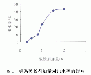由图1看出,破胶剂加量越大,出水率越大,破胶剂加量大于1.5%,出水率变化趋于缓慢。因此,破胶剂的适宜加量为1.5%。