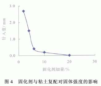 从图4看出,同样条件下,添加20%粘土的同时加入6%固化剂,可使固化剂加量大大减少,并且针入度可降至0.5mm以下,证明利用粘土取代大部分水泥类水硬材料,既可达到处理废弃钻井液的目的,又降低了处理成本,强度可以达到要求。